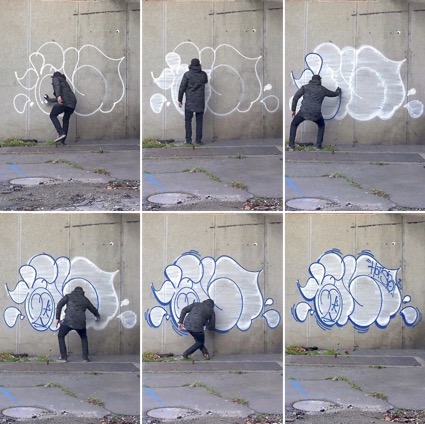 Each new act of signature tirelessly reactivates this ductus, this sequence of strokes that produces a form progressively stabilized over its occurrences. If we are regularly called upon to sign in the course of our life as a legal person, tag and throw-up differ in the intense productivity that sets up repetition as a daily gesture and makes the proliferation of names and the saturation of urban spaces the horizon of the writing act. However, the throw-up adds another specificity to this recurrence of inscriptions. At the very core of its execution, it makes the repetition of the form tracing, for the initial line and for its final outline, the very conditions of its graphic existence. Combined with the size of the inscriptions, this doubled gesticulation gives the performance a very special twist. While mastery is usually focused in the hand and wrist for tracing a signature, the whole body occupies the space for producing a throw-up. The physical performance combines a control of the flow of pressurized aerosol paint with the precision of movement, including coordination between arm sweeping and lateral leg motion. The drawing of a throw-up is a programmed contortion, even timed in certain emergency situations. The succession of strokes, one after the other, unfolds according to the rhythm of the graphic elaboration.