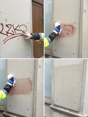 The use of chemical solvents goes hand in hand with a green scraper (a kind of dish scouring sponge) and several clean rags (figure 2). The buffers pour a small quantity of aqueous product on the scraper, coat the graffitied surface with it in small circles, and leave it to act for a short time. They carry on their circular movements without pressing on the scraper until the letters are distorted by the ink or paint that gets liquefied. They then remove the pasty mixture that has formed with a clean rag. Finally, they remove the remaining part with another clean rag, while drawing straight strips from top to bottom. The subtle proportioning of the products and the movement of the rags underline the importance of a timely coordination between the action of the heterogeneous elements and the reaction they are likely to trigger between them. Whether the action is too light or too fast and the graffiti remains, whether it is too long or too vigorous and the surface is permanently damaged.