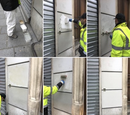 The graffiti buffers also act according to a ritualized movement which takes the form of a choreography (Denis and Pontille, 2021, 2024). Once on the site, they get out of their vehicle with their gaze turned towards the facades, approach the graffiti to be treated, examine it for a few seconds, take a photo, and then, while scrutinizing even more closely, they invariably reach out their hand to run their fingers over the surface several times. A perception intensifier, this haptic gesture is important in many respects. First, by touching, buffers explore the properties of both the materials of the surface and the matter of the graffiti. More precisely, they engage in what performance contracts with municipalities call the “graffitied surface”, emphasizing the material interdependencies at play that they have to deal with. Second, touch helps them to estimate the resistance of materials as well as their fragility in order to choose the appropriate tools and products at their disposal. Lastly, through such a tactile contact, they anticipate the conditions for the practical implementation of a removal technique. This systematic introductory sequence is then followed by the specific rhythm of each of the removal techniques. Let’s take a look at the two most frequently performed ones.